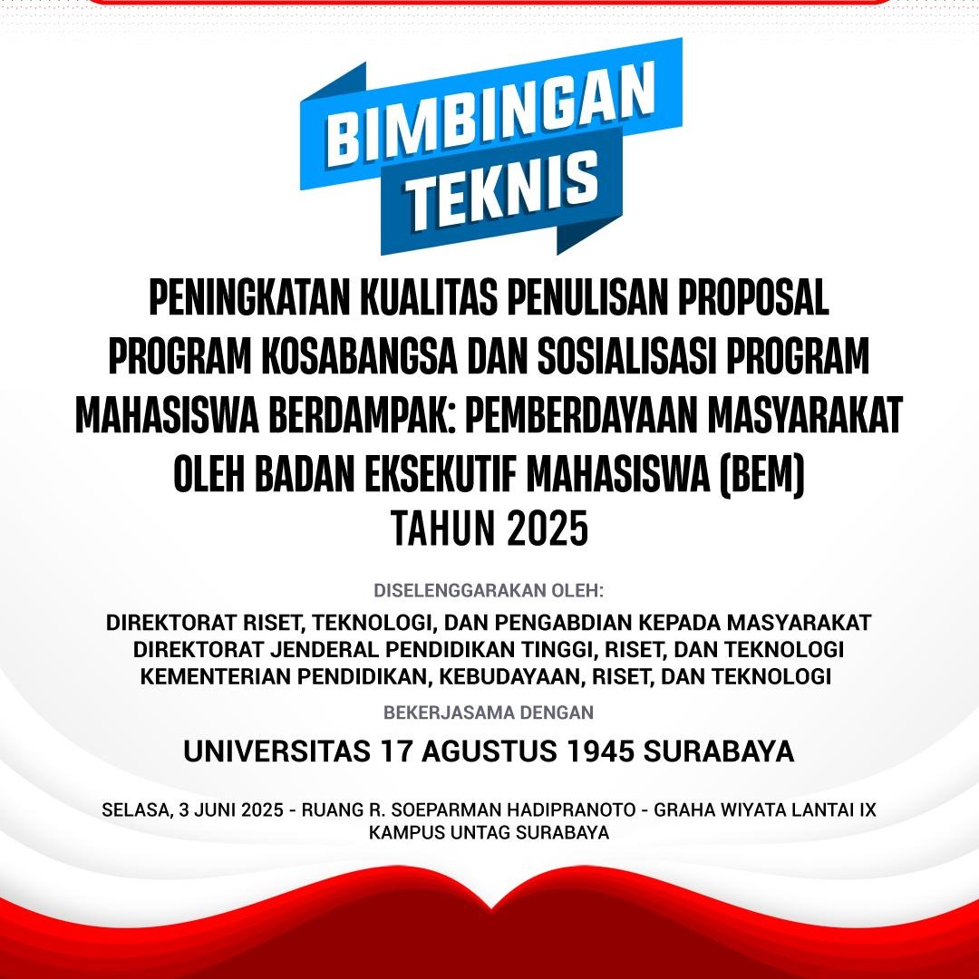 Dalam upaya meningkatkan kapasitas dan kualitas mahasiswa dalam menulis proposal Program Kosabangsa serta menyosialisasikan Program Mahasiswa Berdampak: Pemberdayaan Masyarakat, Badan Eksekutif Mahasiswa (BEM) Universitas 17 Agustus 1945 Surabaya menyelenggarakan kegiatan Bimbingan Teknis Tahun 2025.